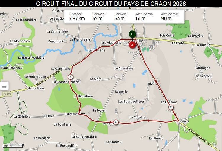 Le départ sera donné à Cuillé à 14H. La course se terminera sur le circuit final de 8 km qui passera à Gastines 4 fois.